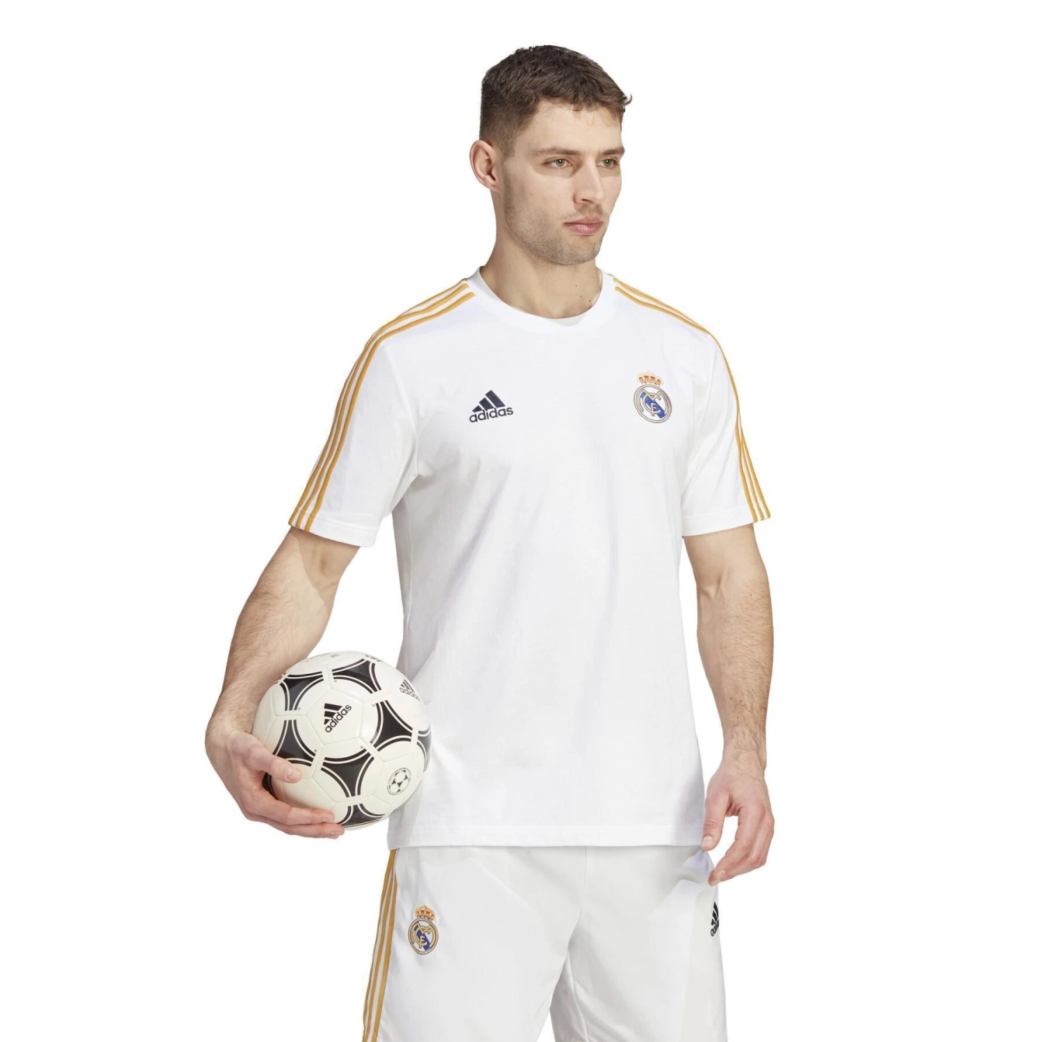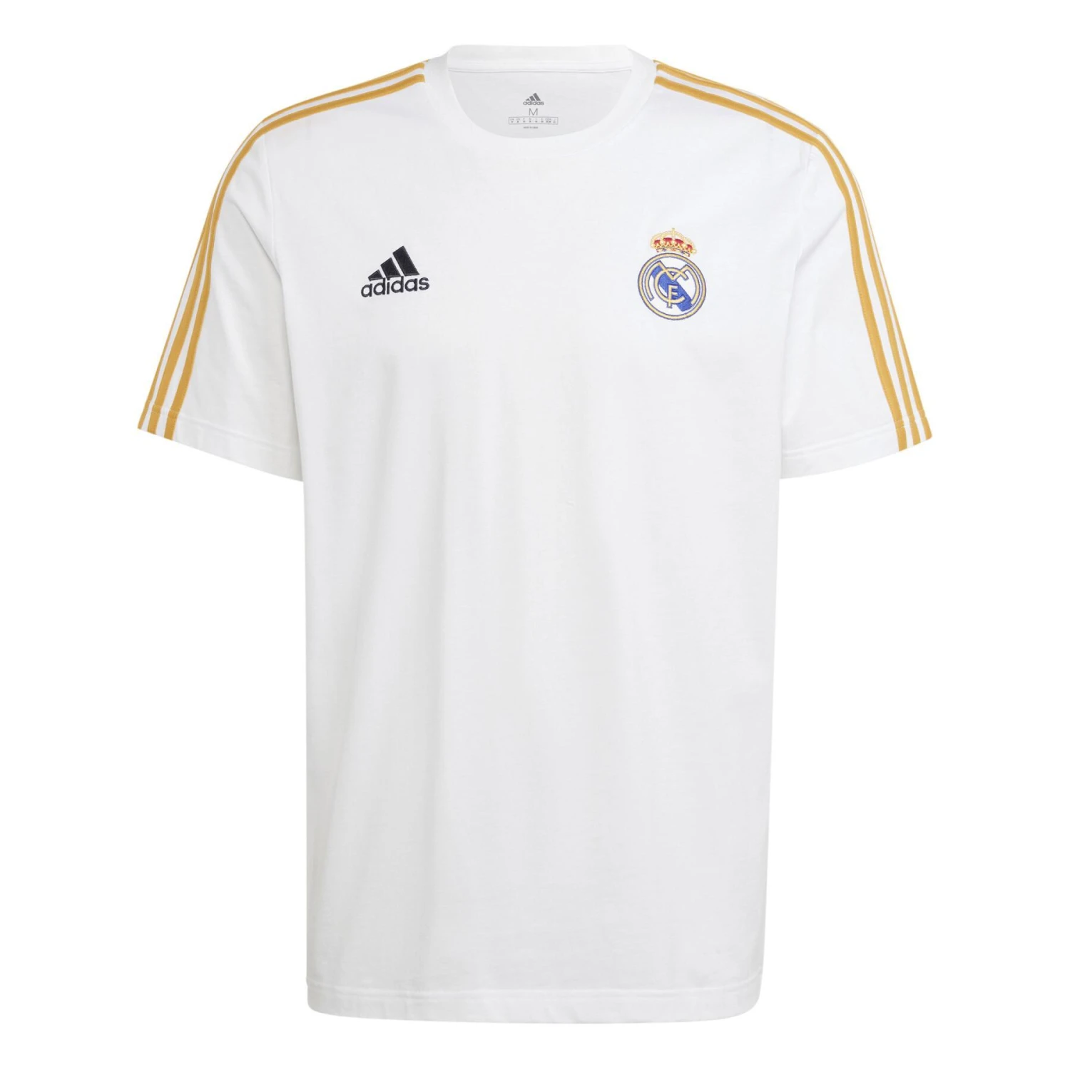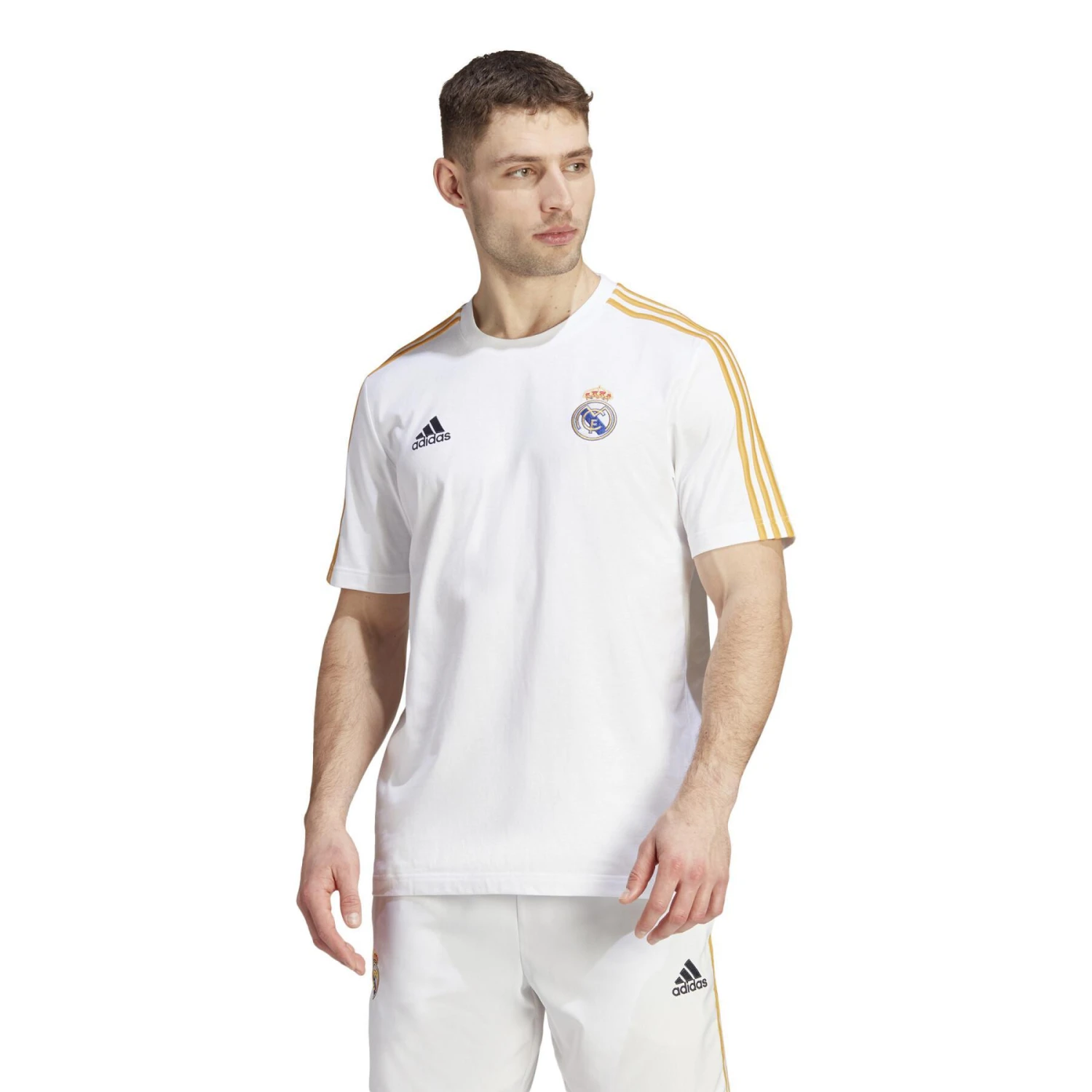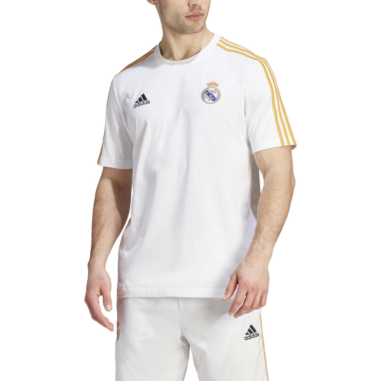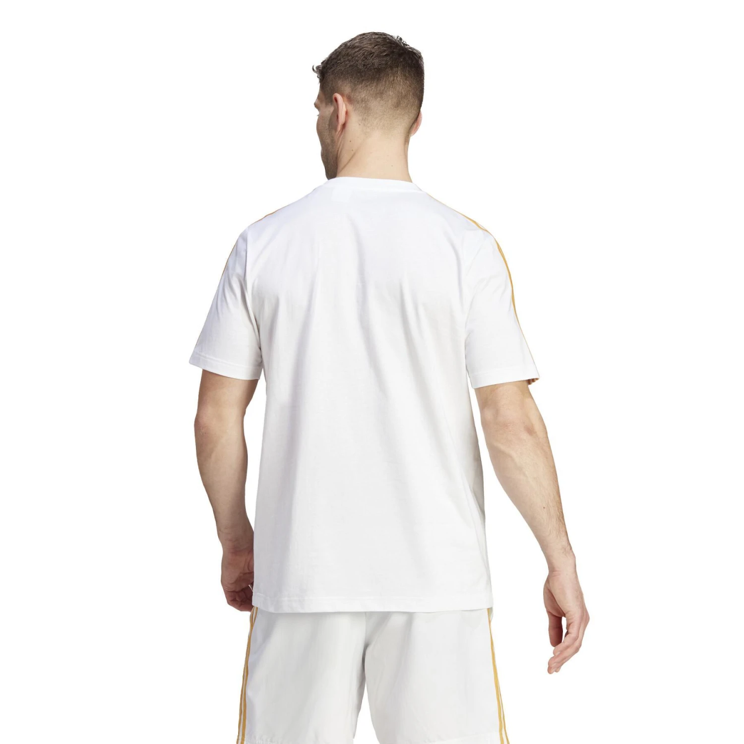 Dieses T-Shirt Real Madrid adidas zeigt die klassische Eleganz der Heimausrüstung und hat drei goldene Streifen auf den Schultern. Es ist aus weichem Baumwolljersey gefertigt, um den Fans maximalen Komfort zu bieten. Ein eingewebtes Vereinswappen auf der Brust signalisiert look.