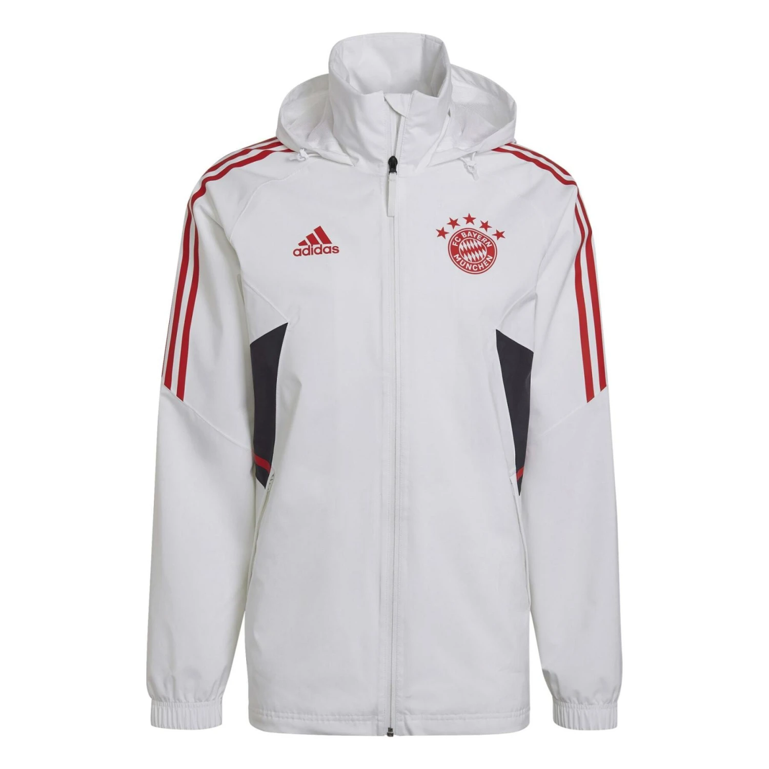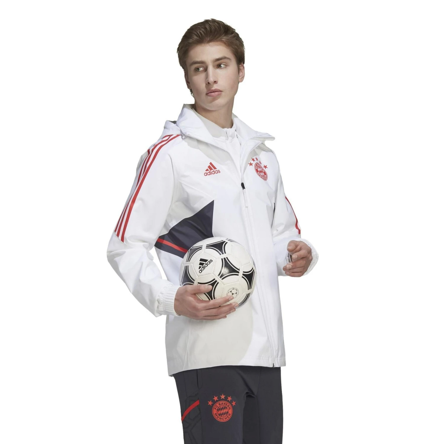 Große Vereine müssen trainieren, um unter allen Bedingungen spielen zu können. Das bedeutet aber nicht, dass die Spieler des FC Bayern jedes Mal leiden müssen, wenn der bleierne Himmel den Trainingsplatz bedroht. Diese Fußballjacke adidas bietet dank des wasser- und winddichten RAIN.RDY-Schutzes und der abnehmbaren Kapuze eine willkommene Erleichterung. Hergestellt aus 100 % recycelten Materialien, ist dieses Produkt nur eine unserer Lösungen, um Plastikmüll ein Ende zu bereiten.