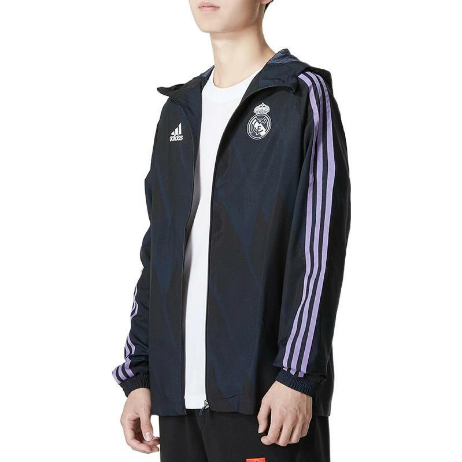 Zeigen Sie Ihre echten Streifen. Die dynamische Grafik dieser Fußball-Windjacke adidas Real Madrid greift den Look der Außenausstattung des Vereins auf, der vom Wappen inspiriert ist. Wenn du unterwegs bist, kannst du die Jacke mit einem Reißverschluss schließen, um vor den Elementen geschützt zu sein. Der taillierte Schnitt sorgt für ein schlichtes Aussehen. Dieses Produkt wird aus 100 % recycelten Materialien hergestellt und ist eine unserer Lösungen, um Plastikmüll ein Ende zu setzen. Eng anliegender Schnitt.